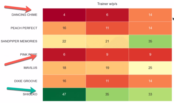 Pick Pony's Past Performance Sheets automatically scan and highlight above-average trainer stats for you.