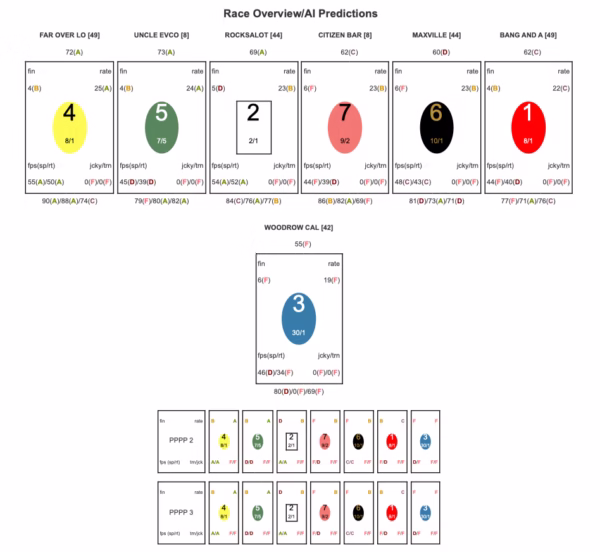 Notes: Pick Pony analysts see unanimous support for Uncle Evco on the class drop and stretch-out, with every analyst including this runner on top or second. Far Over Loaded is the key upset candidate off the projected pace setup, with several models elevating this runner to win status despite higher odds. Rocksalot profiles as a consistent underneath player, and Citizen Barrett rounds out most trifecta and superfecta constructions as a reliable late-running type.