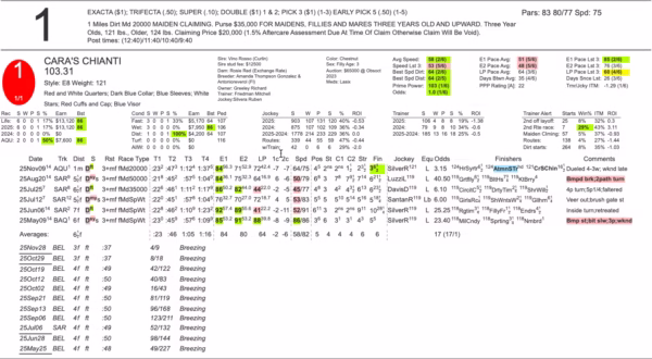 Cara’s Chianti holds appeal as the less exposed option in a weak field. The Mitchell Friedman trainee showed some ability in her debut and returns with Ruben Silvera aboard. While she lost to Autumn’s Turn last time, she has room for improvement with more seasoning. The rail post concerns exist based on recent track statistics, but in a race this slow, position matters less than pure ability.
