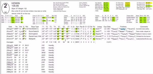 The identical ownership between Tenma and Howin creates an interesting dynamic, though both fillies possess the individual class to win this Grade 3 event. Howin’s recent training sessions alongside Baffert’s top two-year-olds suggest she’s maintaining sharp condition while developing tactical maturity.