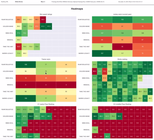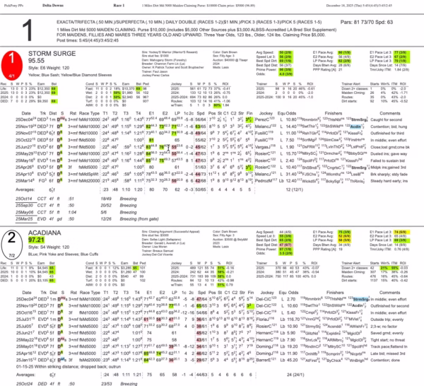 - Sprint Distances (5f – 7f): Delta Downs is a 6-furlong bullring that historically favors Early Speed (E). Recent meet statistics indicate that ~35% of 5-furlong winners go wire-to-wire. The inside posts (1-3) are generally advantageous. However, on a wet track, the bias often shifts slightly to favor stalkers who can save ground and pounce as the early speed tires in the mud.