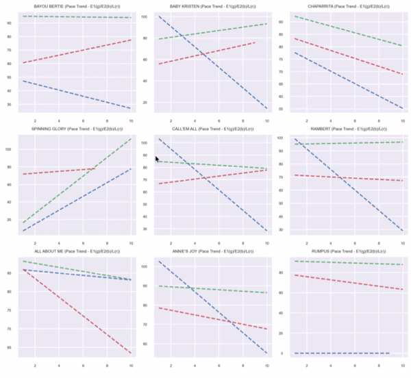 Pace designations suggest a very lively early tempo. Deccan Prince is tagged as a mid-pack leader from the inside; Pico d’Oro is fast leads; Parrot Head is a fast stalker; Brit’s Wit is fast leads; Gorilla Trek is fast leads; Towering Storm is a fast closer; Bizzee Channel is fastest leads; Bello Creedo is slowest leader; several others are mid-pack stalkers.