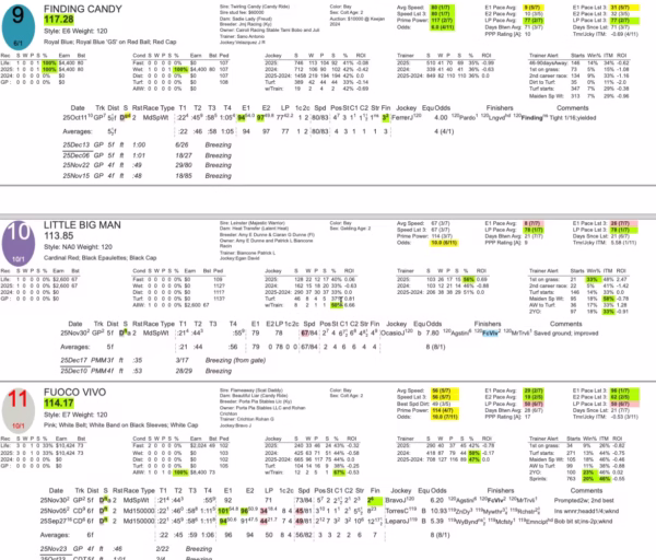 Wistucky enters for trainer Claude McGaughey III and rider Miguel Angel Vasquez. The four-year-old colt brings tactical speed and has competed successfully at this level. Vasquez ranks among the meet’s leading riders and shows strong chemistry with the McGaughey barn.