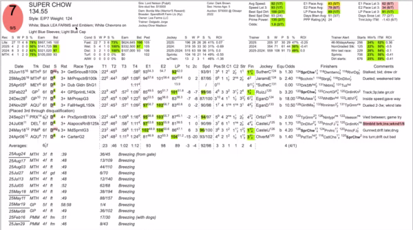Super Chow brings extensive stakes-winning credentials to this contest, having captured multiple graded stakes victories including the Grade 3 Toboggan Stakes, Tom Fool Handicap, and Maryland Sprint Stakes in 2024. The now four-year-old colt has built his reputation as a front-running speedster who excels in gate-to-wire scenarios.
