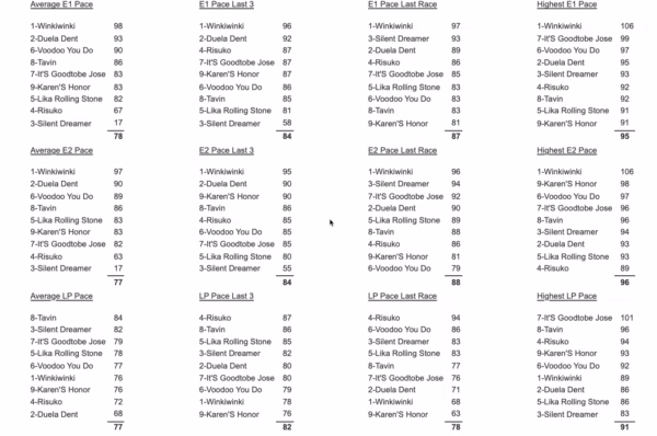 The five-furlong turf distance typically produces moderate early fractions with acceleration in the final stages. Bibi Dahl’s gate issues at Saratoga suggest she may settle off the early pace, positioning her for a late rally. Rosies Pinot showed early speed in her last start, indicating she could press or set the early pace.