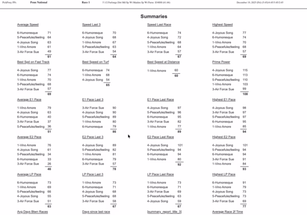 Vino Amore makes her second start at the distance from the rail with Wilfredo Corujo for Robert Wolfe Jr. While the inside post presents challenges at this track, second-time starters often show improvement. Air Force Sue adds depth from post 3 with Maicol Inirio for Flint Stites, who consistently develops competitive runners at Penn National.