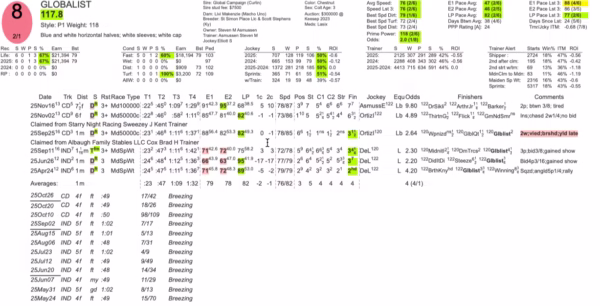 Late sequence wagering should focus on the Asmussen dominance in race eight with Runnin N Gunnin while using Love Tank and Appropriated Funds underneath. The ninth race presents a spread scenario where the Asmussen runner is vulnerable, making R D C Posse and Tigers ‘n Bears excellent value plays.