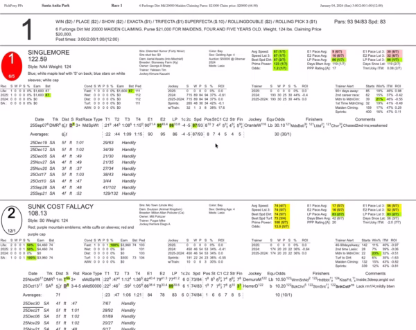 Key wagers include a $20 win bet on Singlemore at projected 6-5 odds, a $10 exacta box of Singlemore and P Town Prancer ($20 total), and a $2 trifecta with Singlemore and P Town Prancer on top over Guaguarero, Charmz Away, and Sunk Cost Fallacy ($12 total). For aggressive bettors, a $1 superfecta box of the top four adds lottery-ticket potential ($24 total).