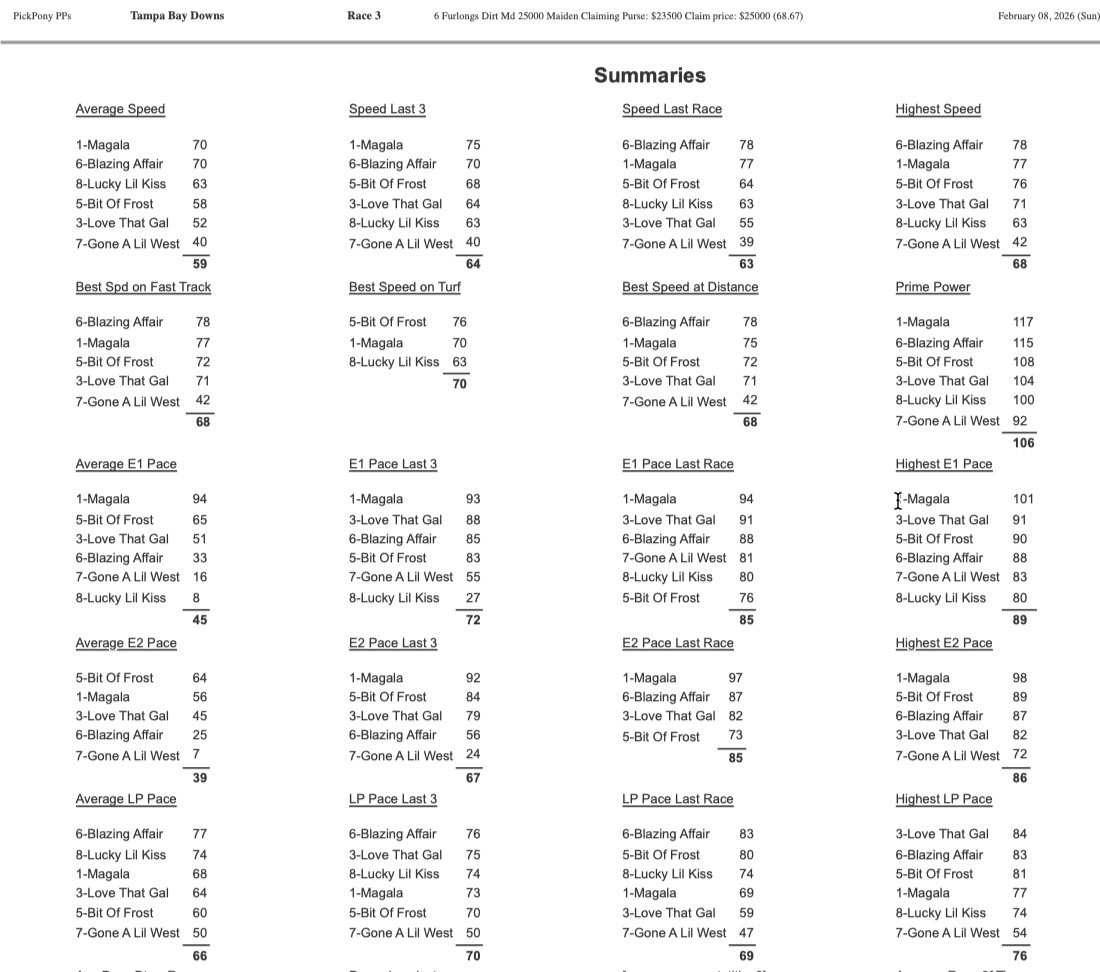 Laloba Feroz (if she draws in or runs) and Tic Tic Tic Boom are veteran mares. Rose View has speed but is stuck on the also-eligible list history in the notes. Assuming a standard field, Tic Tic Tic Boom is a closer who needs pace. The pace scenario looks murky, which often favors the horse who gets the first run.