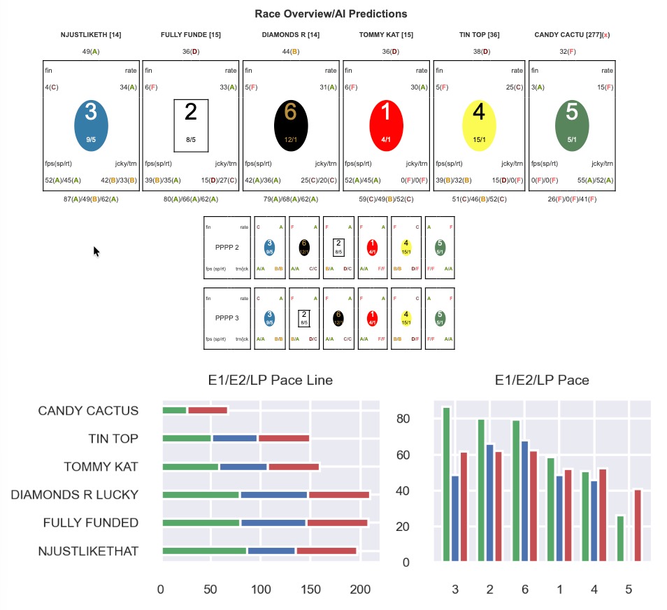 AI-generated projections for the upcoming race, derived from prior AI analysis for speed and pace trends, surface and distance suitability, and current conditions. Grading scale: A = elite • B = above average • C = average • D = below average • F = poor • — = no data |